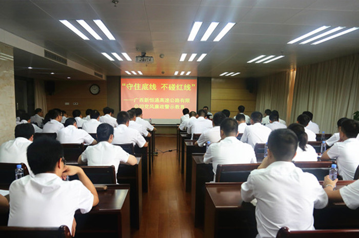 活動上,新恒通公司黨委書記、董事長賴水平還對與會人員進行了廉政集體約談。賴水平感謝吳雄飛老師給大家上了一堂別開生面的廉政警示教育課,作為交通基礎設施建設行業(yè)的業(yè)主單位,在廉潔從業(yè)的道路上,他提出幾點要求和期望:一是加強學習,提升道德修養(yǎng),堅定理想信念;二是嚴于律己,規(guī)范作風行為,筑牢防腐堤壩;三是嚴以用權,增強廉政意識,緊守從業(yè)底線;四是守土有責,堅持“一崗雙責”,深化責任落實。賴水平強調(diào),廣西交通基礎設施建設正處于大有可為、大有作為的歷史機遇期,面對紛繁復雜的形勢,全體黨員干部要在黨的十九大精神的指引下,緊緊圍繞公司總體工作思路和目標,統(tǒng)一思想,堅定信念,持續(xù)加強作風建設,堅決把紀律挺在前面,耳邊常響廉潔警鐘,心中常筑反腐防線,用廉潔從業(yè)的實際行動為公司“縣縣通”高速公路建設事業(yè)的發(fā)展保駕護航。